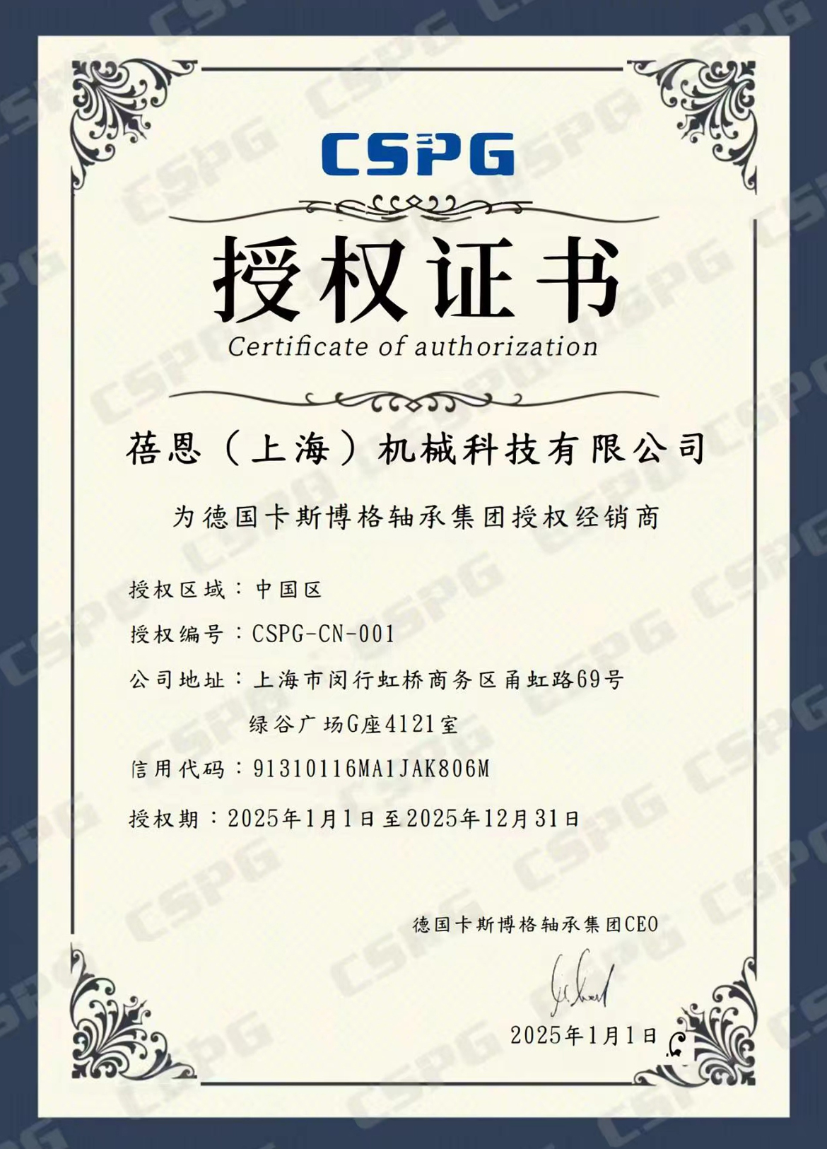 蓓恩機械2025年繼續獲得CSPG(精密主軸軸承/高速電主軸)授權